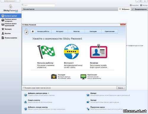 Основные возможности Sticky Password: • Защитник паролей использует новейшие технологии и противостоит кейлоггерам и другим шпионским программам. Он информирует пользователя о попытках компьютерных программ и библиотек заполучить информацию из других программ. • Переносная версия позволяет иметь пароли всегда под рукой. Sticky Password можно запускать с любого переносного устройства - USB диска или даже с CD. • Открывать доступ к паролям, используя USB или Bluetooth устройство. Теперь вам совершенно не нужно вводить пароль. • Пароли защищены мощными алгоритмами шифрования, которые невозможно взломать за приемлемое время. • Автоматическое заполнение форм работает для любых программ и вэб-страниц. Пароль, логин и другие поля заполняются автоматически только если это необходимо. • Вы можете сохранить несколько паролей и логинов для одного аккаунта. • Простота в использовании: вы можете использовать и изменять сохраненную информацию прямо из окна программы, которая их использует. • Автоматическое резервное копирование базы паролей: измененные или удаленные пароли могут быть восстановлены в любое время.